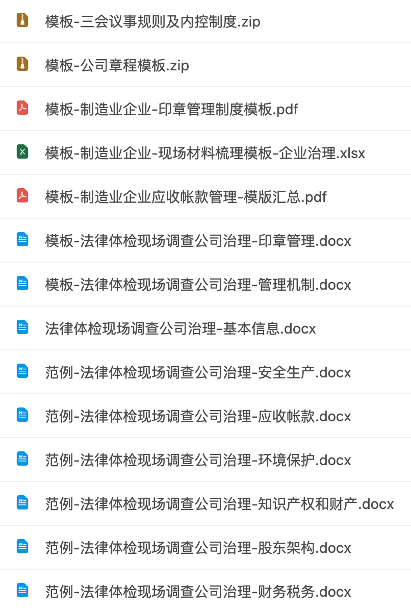 以企业治理为例,除了要了解企业的基本信息,知到所的法律服务产品还设计了股东架构、管理机制、应收账款、财务税务、安全生产、财产知产、环境保护、印章管理 8 大类风险排查方案,整理了配套的工作模板供团队成员取用。