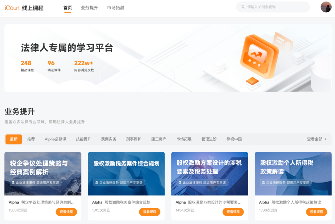 在 Alpha 系统的【线上课程 - 市场拓展】中,也收录了包括极光律师事务所在内等众多优秀律所 / 团队的知识成果,共计 240+ 法律专业课程,90+ 精美课件,帮助律师团队锤炼讲座培训能力,提升客户开拓效率。