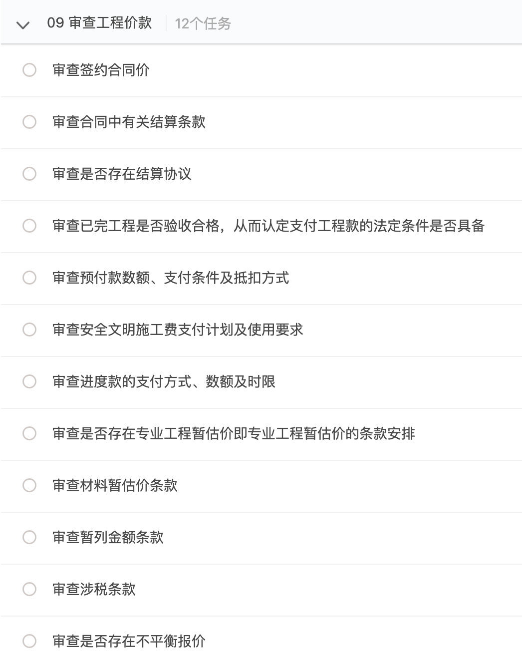 然后,再围绕办案要点框架,不断拆细要点。比如,在“审查工程价款”这一要点中,又可以拆解出 12 个具体的审查事项,完善办案思维结构。