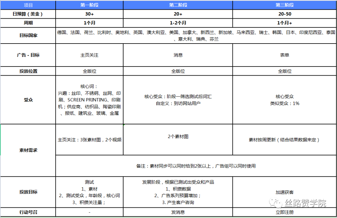 ●单日总预算:20—50 美金(按投放经验给出的建议预算,可以根据具体成效调整)。