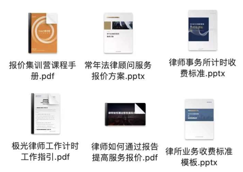 本期报名,还会赠送课程专属大礼包!包含课程手册、常年法律顾问服务报价方案、律师业务收费标准模板、律师事务所计时收费标准、律师如何通过报告提高服务报价、极光律师自用的工作计时指引等等。