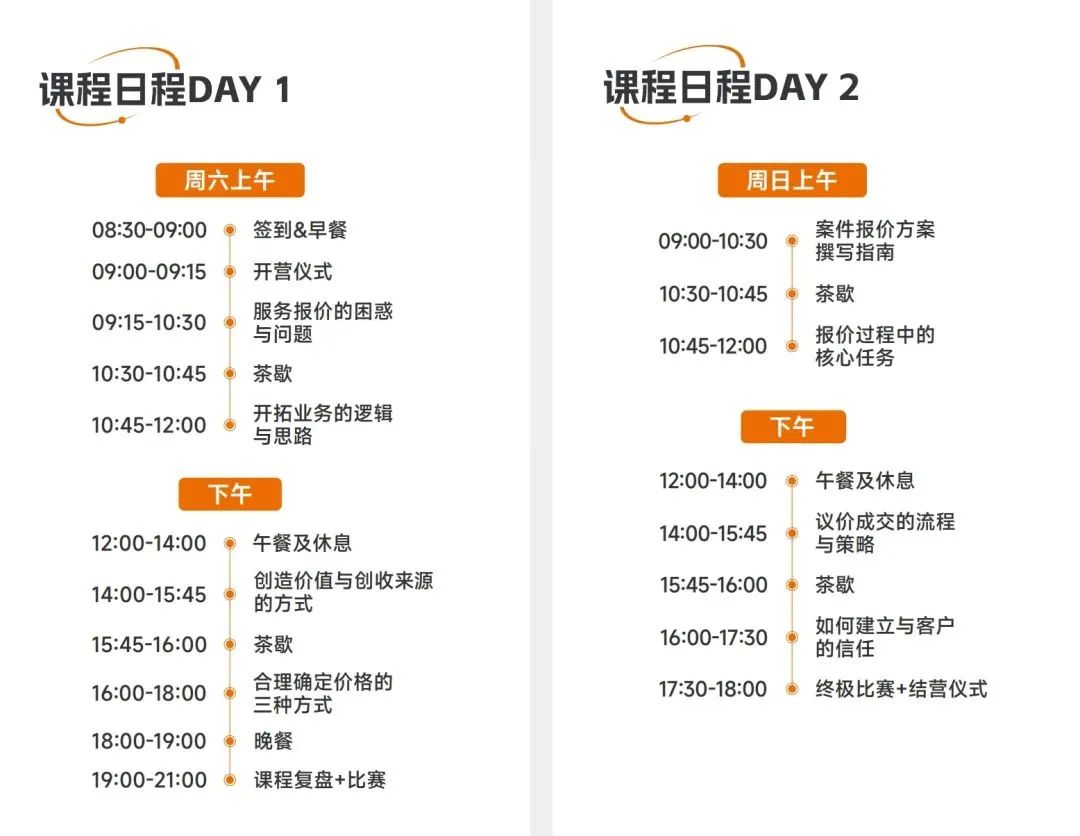在两天一晚的集训中,我们将深度挖掘客户痛点与需求,体系化学习法律服务产品打造的路径与技巧,全方位领悟律师报价策略和谈判方法,帮助律师“从被动到主动”,实现获客的飞跃式提升。