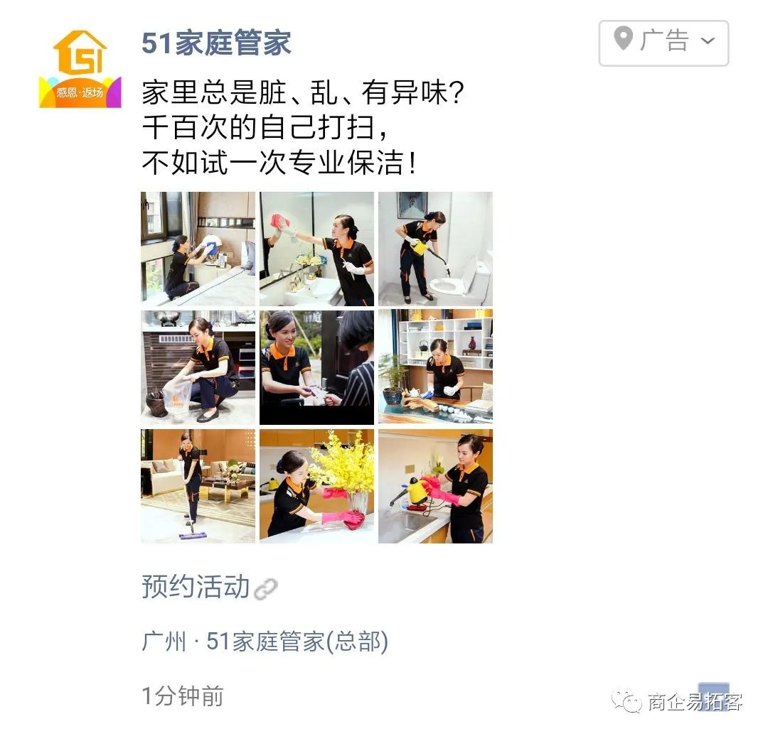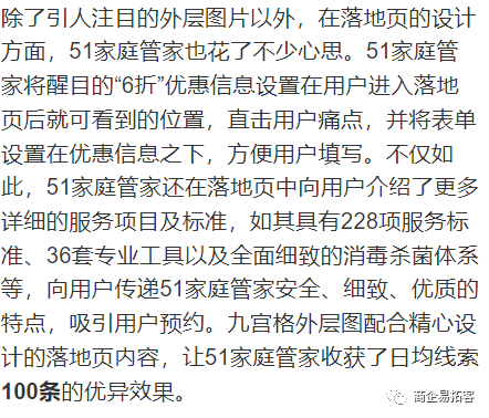 在此次推广中,优化师建议外层图片使用九宫格形式,向消费者展现51家庭管家不同的服务场景。九个真实的服务场景让消费者更加直观和全面的了解51家庭管家的服务内容和服务特色,很好的引起了目标消费者的兴趣,收获了3%-4%的点击率。