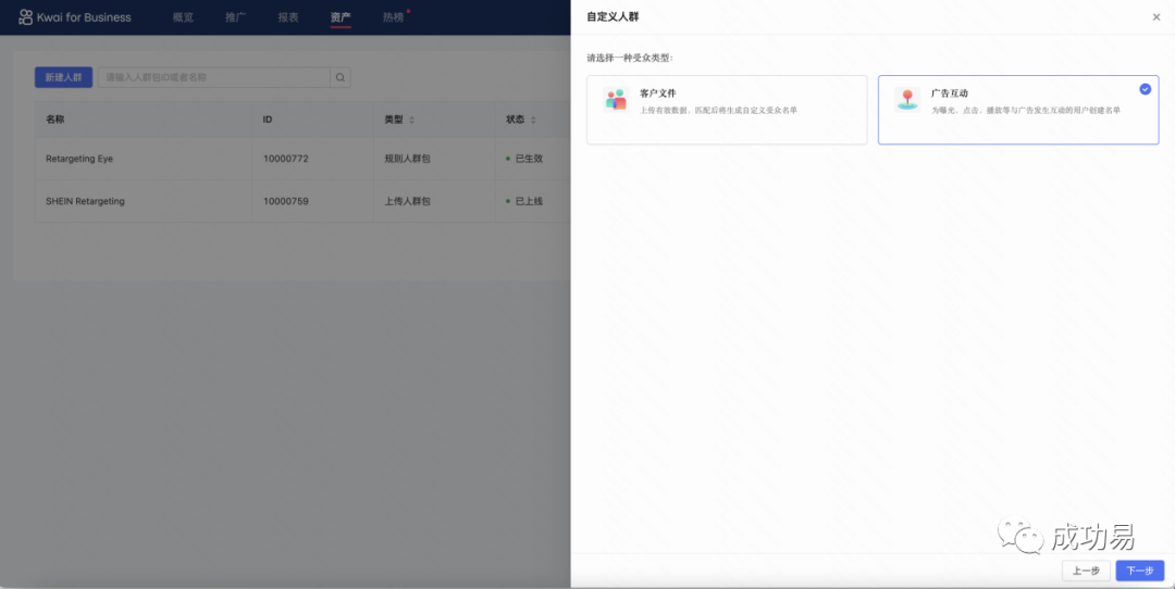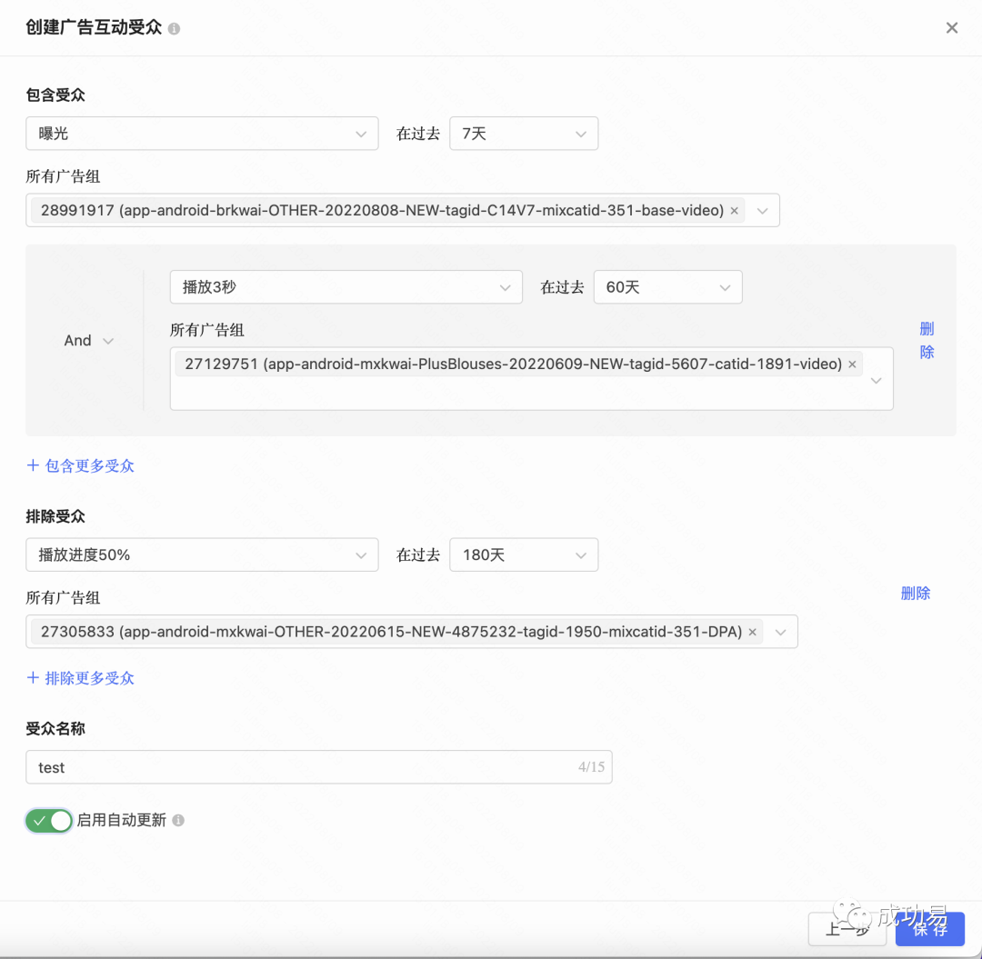 △ 点击收听音频课程 △在当今的短视频营销领域,广告主面临着一个挑战:如何有效地触达和转化目标受众?为了解决这个问题,快手商业化平台推出了一种创新的广告互动功能,让广告主可以根据用户的互动行为,自定义和细分他们的受众人群。这种功能不仅可以帮助广告主提高广告的曝光率和点击率,还可以实现受众的重复触达和深度转化,从而提升广告的投资回报率。本文将介绍这种广告互动功能的原理,优势和使用方法。01功能亮点快手商业化平台的广告互动功能具有以下几个功能亮点,让广告主可以更加灵活和高效地自定义和细分受众人群:1.基于互动行为的人群圈选广告主可以根据用户对广告的不同互动行为,如点击,曝光,3s,5s,25%,50%, 75%,100%的视频播放等,选择和圈选他们想要触达的受众人群。2.灵活的时间窗口选择广告主可以根据自己的营销目标和策略,选择不同的时间窗口,从而覆盖不同的受众人群。现阶段,快手商业化平台支持基于7天,14天,30天,60天,90天和180天的时间窗口选择。3.广泛的广告单元选择广告主可以选择所属account 下的所有的 ad_group (unit_id) ,从而实现跨广告单元的受众圈选和触达。4.增加/排除自定义受众的功能广告主可以根据自己的需要,增加或排除自定义受众,从而实现更加精准和有效的受众定向和优化。5.自动更新的人群数据快手商业化平台的广告互动功能可以实时更新人群数据,让广告主可以随时调整和优化自己的广告投放和效果。△ 点击收看视频课程 △02使用步骤▶第一步:进入自定义受众落地页图片来源:Kwai后台截图打开快手商业化平台的网站,点击左侧菜单栏的“自定义受众”选项,进入自定义受众落地页。在落地页中,找到“广告互动”部分,点击“创建”按钮,进入“广告互动”人群圈选部分。▶第二步:设置包含受众和排除受众图片来源:Kwai后台截图在“广告互动”人群圈选部分,您可以设置包含受众和排除受众,从而自由定义和管理您的受众人群。◆包含受众您可以选择“并且”或者“或者”来打包用户,表示您想要触达的受众人群需要满足的条件。例如,您可以选择“并且”,然后选择“点击”和“播放完成”,表示您想要触达的受众人群是既点击了您的广告,又播放完成了您的广告的用户。◆排除受众您可以选择“或者”来排除更多用户,表示您不想要触达的受众人群需要满足的条件。例如,您可以选择“或者”,然后选择“曝光”和“3s”,表示您不想要触达的受众人群是只曝光了您的广告,或者只播放了3秒的您的广告的用户。在设置包含受众和排除受众时,您可以根据以下几个方面来圈选和细分您的受众人群:●广告单元您可以搜索并选择所属主体下跨账号下的不同account包含的所有广告组,从而实现跨广告单元的受众圈选和触达。您可以利用ID+adgroup名称来搜索和选择您想要的广告组。●互动类型您可以选择跟广告视频发生不同互动类型的行为受众,从而实现基于用户互动行为的受众圈选和触达。您可以选择以下几种互动类型:点击,曝光,3s,5s,25%播放进度,50%播放进度,75%播放进度,播放完成。●时间窗口您可以选择在过去7天,14天,30天,60天,90天,180天和广告产生互动行为的用户圈选,从而实现不同的时间窗口的受众圈选和触达。您可以根据您的营销目标和策略,选择不同的时间窗口,从而覆盖不同的受众人群。▶第三步:启用或不启用自动更新功能图片来源:Kwai后台截图在设置好包含受众和排除受众后,您可以选择是否启用自动更新功能,从而实现受众人群的实时更新和优化。◆启用自动更新功能如果您启用自动更新功能,圈选人群每天会重新计算和更新一次,从而让您的受众人群始终保持最新和最准确的状态。◆不启用自动更新功能如果您不启用自动更新功能,圈选人群为一次性计算,从而让您的受众人群保持固定和稳定的状态。▶第四步:保存并创建人群图片来源:Kwai后台截图在完成上述步骤后,您可以点击保存按钮,创建您的自定义受众人群。您可以在自定义受众落地页中,查看和管理您创建的人群,以及使用您创建的人群进行广告投放和效果分析。▶第五步:定向人群图片来源:Kwai后台截图在创建广告组层级的目标人群中选择定向或者排除的自定义人群,从而实现定向投放或排除。自定义受众功能可以让广告主根据自己的业务需求和目标,自由定义和管理受众人群的功能。通过使用这种功能,广告主可以根据用户的互动行为,时间窗口,广告单元等多个维度,来圈选和细分受众人群,从而实现受众的重复触达和深度转化。此外,广告主还可以选择是否启用自动更新功能,从而实现受众人群的实时更新和优化。END 今日作者 花永达北京成功易审核人 | 曹军芳精彩推荐Kwai原生广告使用指南Kwai放量神器——最大转化出价如何在Kwai平台上提升IAA行业广告效果社交APP在Kwai平台上的创意视频与文案制作指南在Kwai投放信息流广告,如何制作好的视频创意和文案? 觉得有用,给个在看