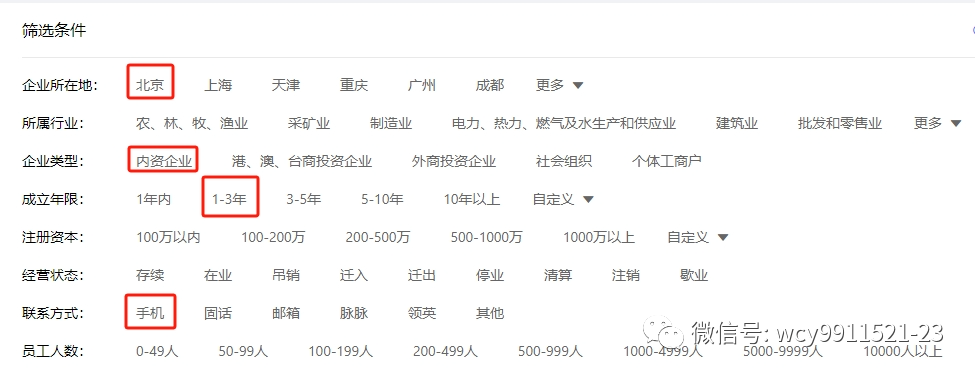 首先沃创云精准资源获客系统覆盖全网数千个数据源,构建了超过3亿家市场主体的全国最全量的企业知识图谱。同时我们也将这些信息细化出了300多个筛选条件:招聘、官网、推广、自媒体等其他和公司业务贴合更紧密的数据维度,通过这些更细的筛选维度,我们就能更精准地找到目标客户,全方位多角度地深入了解客户。例如,只需要找到本地,且条件满足成立2年,有手机方式的内资企业,那么即可根据标签选择即可。