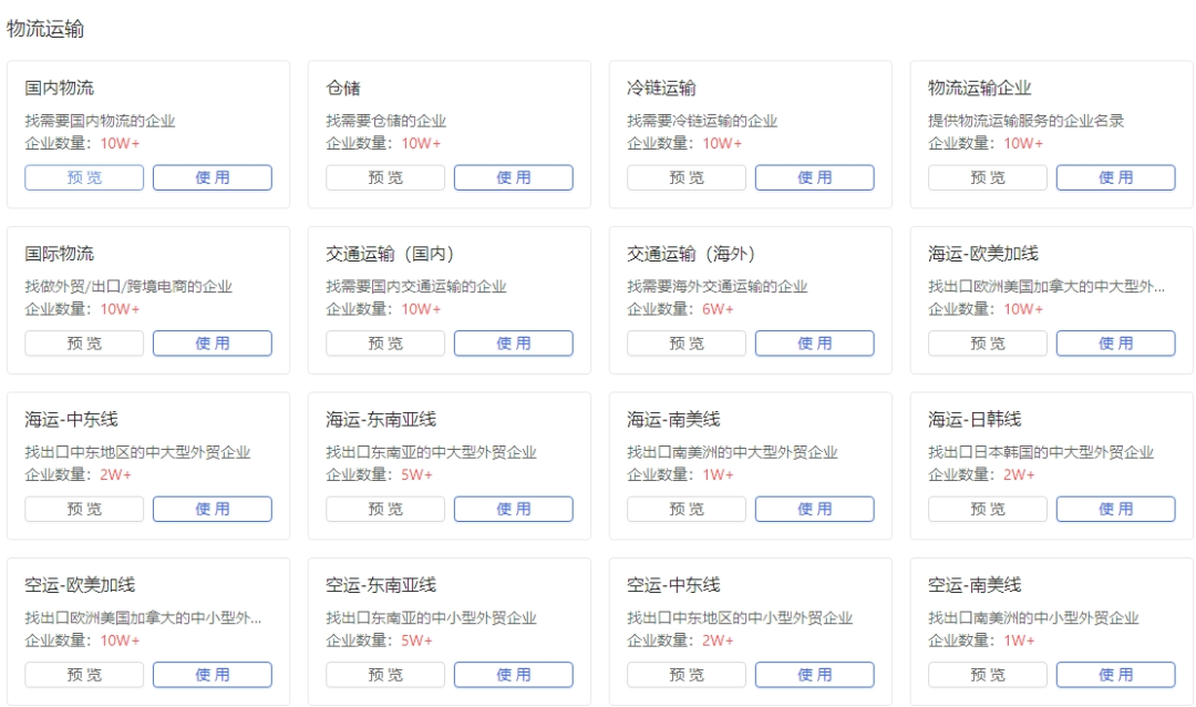 物流运输行业的潜在客群,优选商机结合了对方面的分析,为企业提供了多套适用模板,让企业一键即用,节省大量时间且能够获取精准的意向客群。