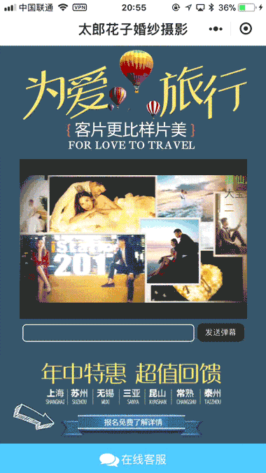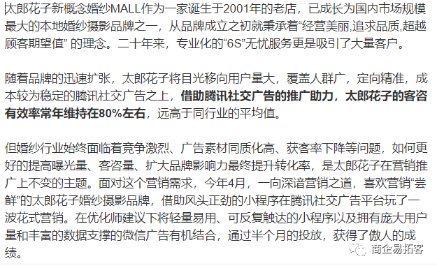 太郎花子的目标用户年龄介于20-35岁,有着追求个性消费,消费观念开放,有着稳定较高的收入的特点。这部分人群更倾向直观生动的广告展现形式,而小程序可以自由定制样式形态的特点,正精准契合了目标人群的体验需求。太郎花子通过“个性化视频+精美样片”的展现形式,打破了婚纱行业创意同质化的局限性,成功吸引了用户目光,提升了用户对品牌的好感度。