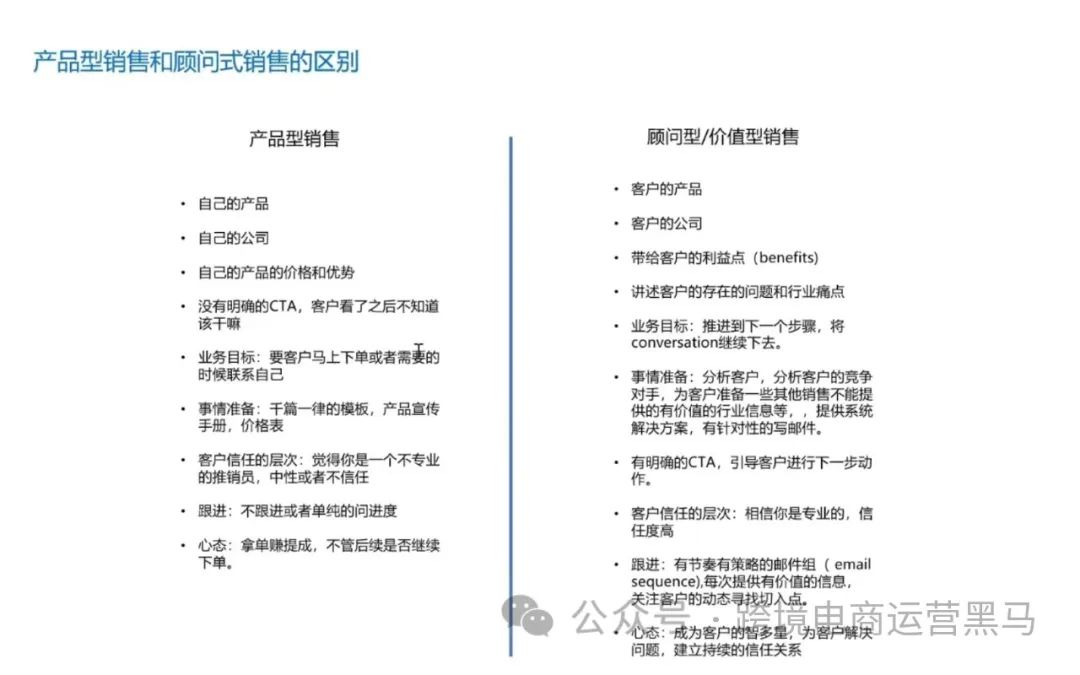 第三条建议:就是不要以自我为中心,要以客户为中心,这也是产品性的销售和顾问性销售之间的一个很大的区别,你的邮件越更多的关心于客户,关心客户目前面临的问题。关心客户的战略转型的方向,关于你如何提供客户价值,客户越有兴趣去回复你那产品型的销售从事,一上来就是恨不得马上,把自己公司的优势,产品的优势全部马上介绍给客户听,然后最好是希望客户马上去付钱,马上就下来,这其实是不现实的,就好比谈恋爱的时候,你刚刚加上别人微信,然后就狂吹自己多厉害。