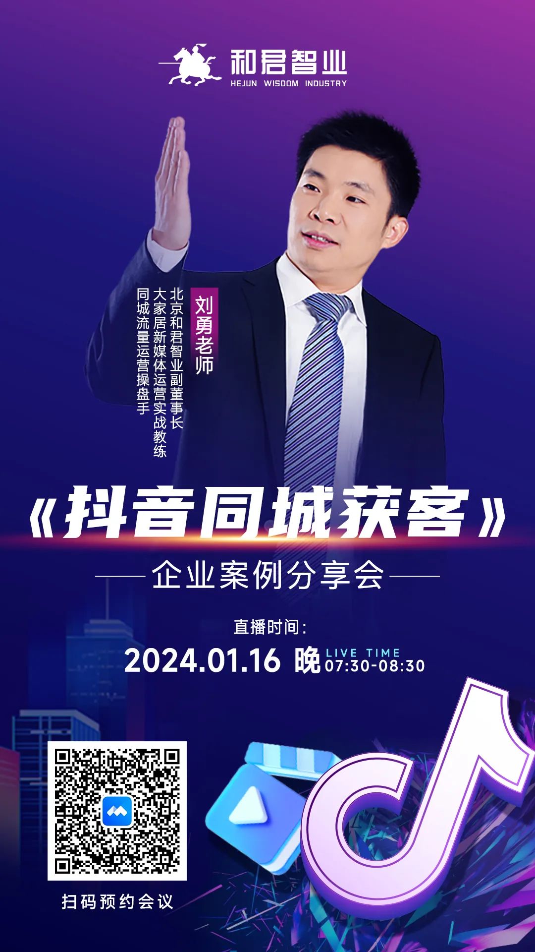 开课啦❗❗❗开课啦❗❗❗开课啦❗❗❗崛起的流量池,再不利用更待何时,1月16日晚19:30-20:30,和君智业实战派刘勇老师倾情打造《抖音同城获客》企业案例分享会,让门店获客更轻松,干货满满,先人一步扫码,先人一步获取,精彩内容不容错过,赶快扫码预约吧!!!【和君智业四大办公室】北京办公室广佛办公室杭州办公室西安办公室全力以赴推动家居建材企业走向成功咨询电话:18911923939咨询电话:15619015919