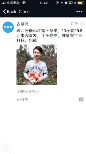 在人群定向上,农梦派将地域选定在了全国三线城市为主的“普通城市”,以求用更低的单价获取更多的曝光。同时,考虑到购买水果的主力军为女性,需要具有一定消费力,所以将人群属性定为了25-50岁的女性;在广告创意上,广告主的家人手捧苹果“代言”,并在文案上突出了产品“果园直发”、“健康安全”的特色,同时,29.8元/10斤的包邮价格也十分具有吸引力。