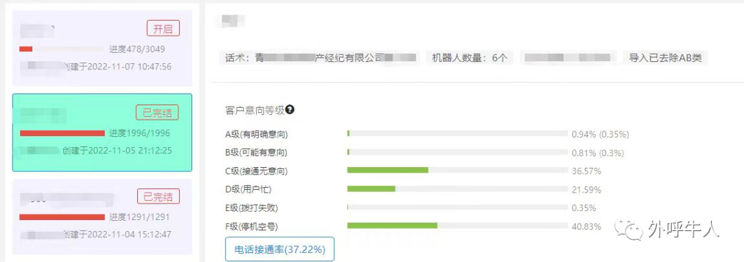 Ai外呼机器人无需人工输入电话号码,后台一键批量导入号码数据,待话术审核通过后,即可自动拨打,根据需求设置时间、拨打频率等,机器人自动外呼更省时省力。