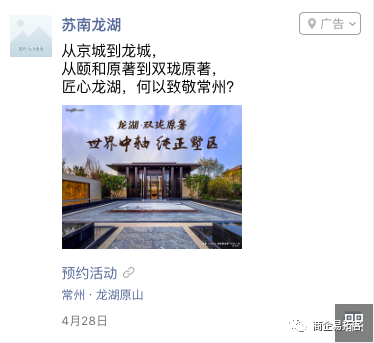 在新品楼盘龙湖双珑原著开盘之际,苏南龙湖在朋友圈投放本地推广广告,但并没有直接推楼盘本身,而是通过推广新品发布会的形式来带动楼盘知名度,以更具创意的形式引起潜在客户的好奇,配合位置自定义打点辐射功能,准确定位楼盘周边人群,就近吸引用户到访。广告外层采用精致、大气的别墅场景吸引用户点击,内层原生推广页简洁优雅,下方采用信息收集模板,引导消费线索的进入,更直接准确的收集意向用户信息,过程中共计收集销售线索100组,截至目前意向客户21组。