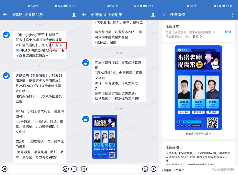 员工收到任务并转发海报、文案-可直接复制转发海报和文案给好友,也可点击【任务详情】查看
