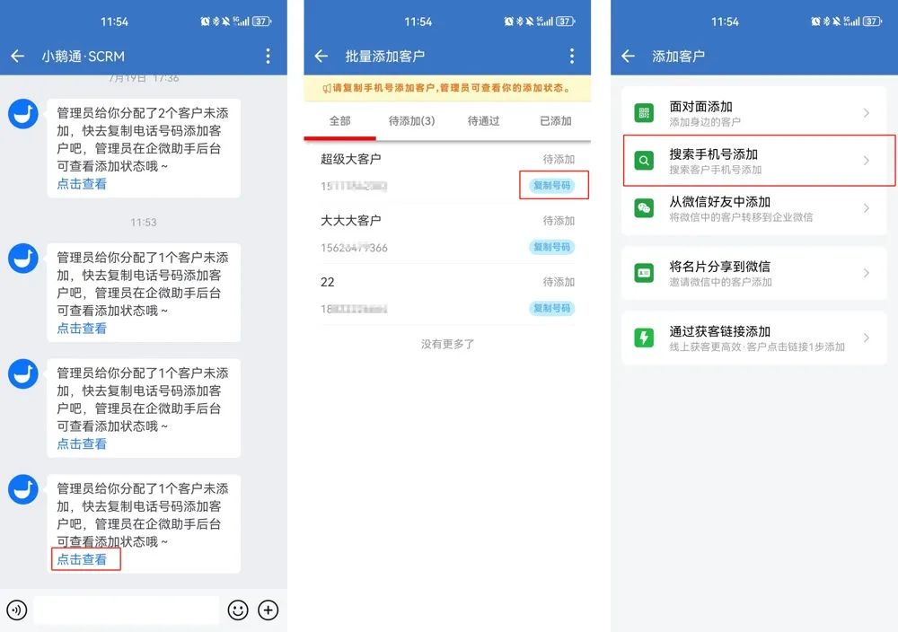 5、批量加客户-使用批量加客户功能可以将大批量客户信息导入系统,然后分配给员工,让员工添加客户微信。同时商家可以对线索的分配与添加情况进行管理与监控。