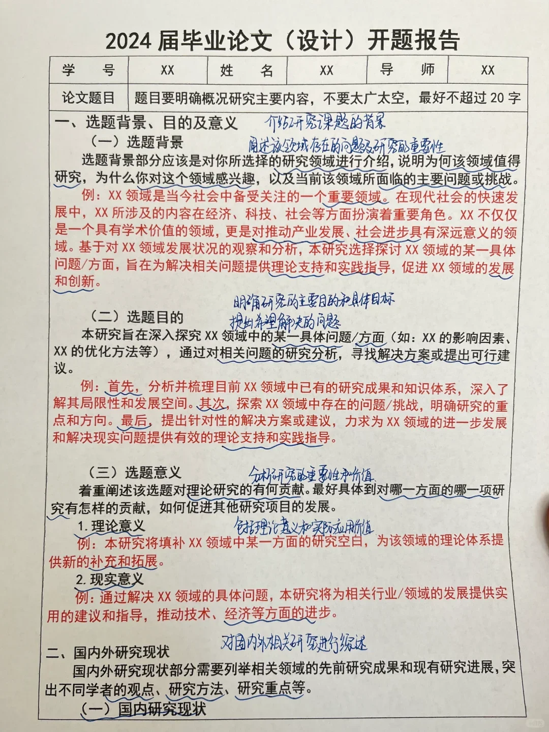 Hey小伙伴们,是不是又到了为毕业论文开题报告头秃的季节啦?别慌,今天就来和大家分享一篇超实用的开题报告撰写指南,保证让你的报告脱颖而出,赢得导师的青睐!👩🏫✨\n📅 首先,明确你的基本信息\n记得在报告首页填写好学号、姓名和导师信息哦!这是最基本的,也是最容易忽视的。👀\n📝 选题背景:引人入胜的开场白\n选题背景是吸引导师眼球的第一步!你需要像讲故事一样,描述这个领域的“前世今生”,它的重要性在哪里,又面临了哪些挑战。🔍 比如:“XX领域,如同现代社会的一颗璀璨明星,在经济、科技、社会的舞台上大放异彩。然而,随着XX问题的日益凸显,我们迫切需要找到解决方案,为这一领域的发展注入新的活力。”\n🎯 选题目的:明确你的‘小目标’\n接着,清晰地阐述你的研究目的。你要告诉导师,你希望通过这次研究解决什么问题,达到什么目标。🎯 比如:“本研究旨在深入剖析XX领域中的XX问题,通过实证研究,为这一问题的解决提供切实可行的建议。”\n💡 选题意义:展现你的‘大视野’\n选题意义部分,要展现你的研究对学术和社会的双重贡献。你可以从理论意义和实践意义两个角度入手。📚💼 理论意义上,你的研究可能填补了某方面的空白,为学术界提供了新的视角;实践意义上,你的研究成果或许能推动相关行业的进步,解决实际问题。\n🔍 国内外研究现状:站在巨人的肩膀上\n在撰写国内外研究现状时,记得广泛搜集资料,对比不同学者的观点和研究方法。📚 通过对比分析,你可以发现当前研究的不足之处,从而找到你的研究切入点。这部分内容要条理清晰,逻辑严密,让导师看到你的学术素养和研究能力。\n📅 最后,合理安排工作进度\n别忘了给自己制定一个详细的工作计划表,明确每个阶段的任务和时间节点。📅 这样不仅可以提高效率,还能让你有条不紊地完成开题报告的撰写工作。\n💪 小伙伴们,开题报告是毕业论文的第一步,也是非常重要的一步。只要你用心准备,认真撰写,相信你一定能够交出一份满意的答卷!加油哦!💪\n毕业论文 #开题报告 #学术攻略 #开题报告怎么写 #开题报告模板 #开题报告技巧