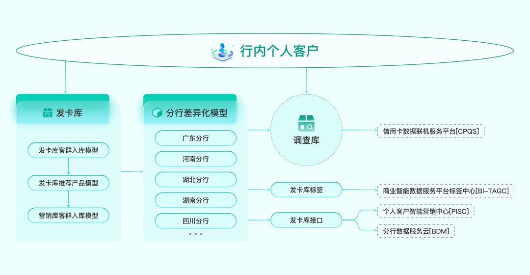 信用卡发卡营销库数据模型包括发卡目标客群和营销客群两大部分。其中,发卡目标客群是面向全量行内客户,挖掘各类型潜在目标客户,并按照模型计算预授信金额、个性化卡产品推荐和营销等级;营销客群是挖掘无差异化审批策略的潜力营销客户。加工完成后下发至信用卡综合管理平台、个人客户智能营销中心、分行集市、标签中心等,是我行信用卡营销获客至关重要的数字化动力之源。