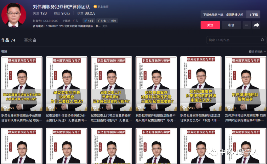 律师的获客,第一要务是打造“名气”,名气越大获客能力越强,怎么打造名气?每一个律师平时都很忙,没空拍视频怎么办——交给AI数字人帮你打造名气即可。当很多律师每天还在花大量时间找团队、选场景、录制剪辑视频时,行业内已经有律师,开始用AI数字人技术实现批量化视频制作生产。 1条视频,至少引流100+,而且每天只需要10分钟。在愈发“内卷”的法律服务行业,智能化手段能提高律师内容生产效率实现律师品牌发展。目前国内已有一些律所/律师开始探索并推出“数字人律师”,不仅提高了内容生产效率,也实现了个人品牌IP打造。以前,这位律师每天至少要花1~ 2个小时写文案、拍出镜口播短视频,不仅耗时,对于自己体力和财力都是一笔不小的付出,有时视频流量数据还不美观。