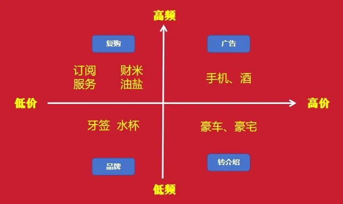 如果你的产品属于这一类,你已经拥有强大的核心竞争力。在这种情况下,你的主要经营策略应当是持续的营销和广告投放。这也解释了为什么在各大平台上,主要的广告投放者往往是这些高价高频的产品。你的任务是精心策划每一分营销预算,确保每一次投入都能带来最大的回报。