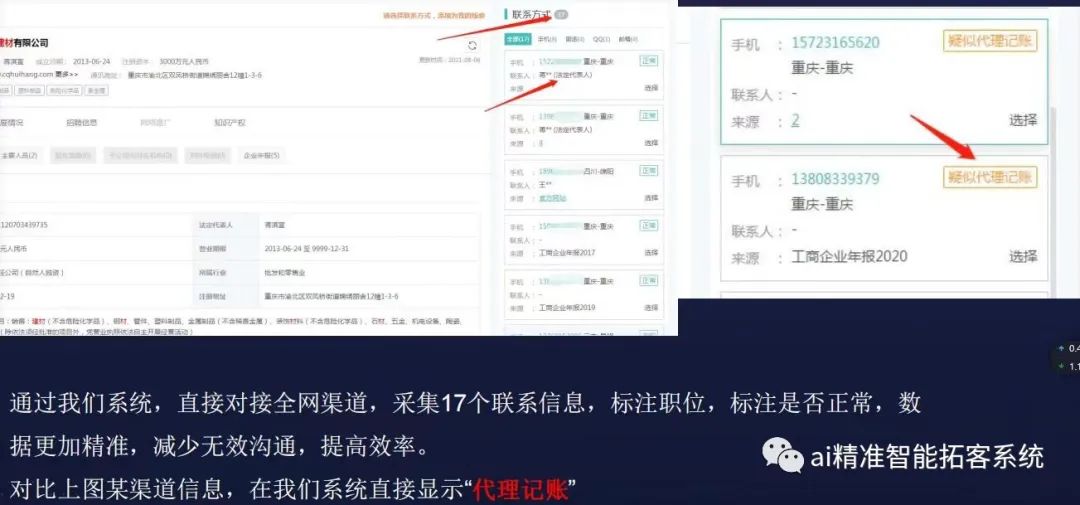 大数据采集,对接的有上百个采集渠道,通过全网72个维度,例如:工商网、城市黄页、招聘简章、网络推广、电子商务等等渠道帮您获取您需要的精准客户信息。一家公司各个维度全网的联系方式一键抓取,智能识别代理记账号码、空号等,帮您获取真实有效数据。