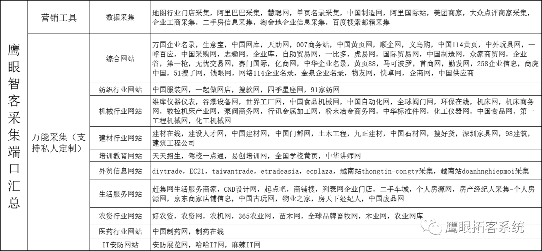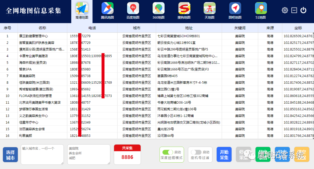 客源采集:软件内部对接200多个网站,涵盖了各行各业的信息,通过软件设置好地区选择行业,就可以获取到想要的客户信息。