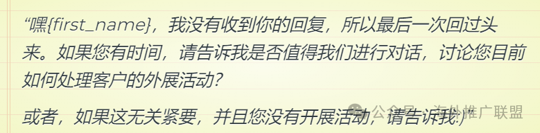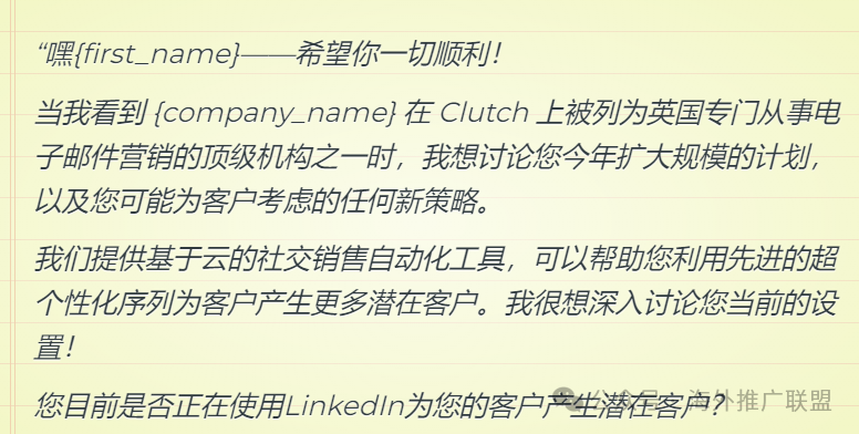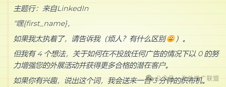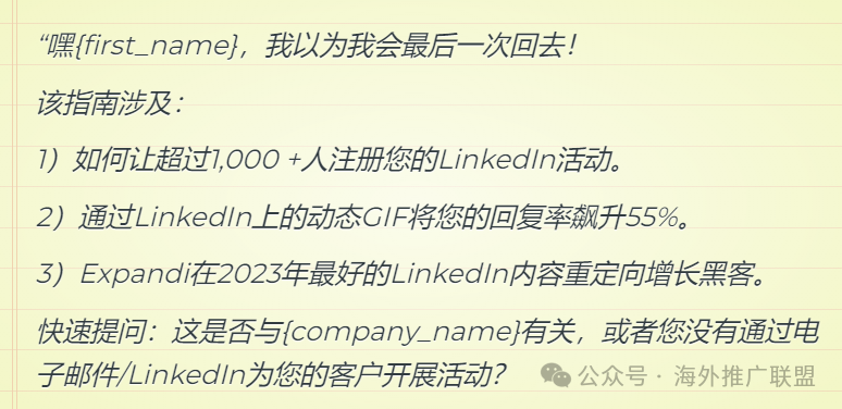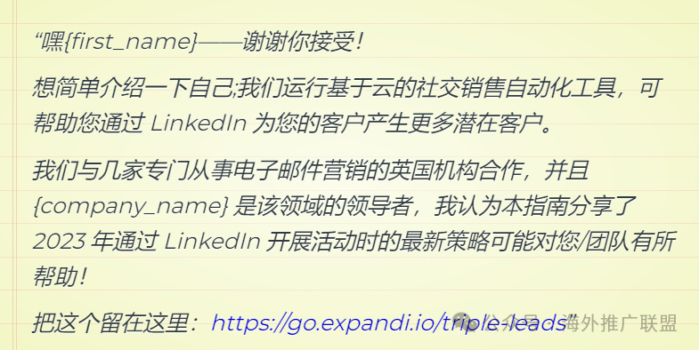 Linkedin开户&投放推广专栏对于希望在自动驾驶仪上预订更多会议、完成更多交易并最终 从外展中获得更多收入的企业来说,多渠道外展是必经之路。顾名思义,多渠道外展使用多个外展渠道来接触您的目标受众。如果您在 B2B 工作,您需要关注的渠道是电子邮件和 LinkedIn。这是为什么呢?在 LinkedIn 上,您可以使用销售导航器甚至默认的免费搜索来筛选您理想的客户角色。如果您想跟进潜在客户,电子邮件是理想的选择。原因如下:LinkedIn上的人们每天收到数百个低质量,垃圾邮件,自动连接请求。如果您仅使用电子邮件进行推广,则会大大降低广告系列的有效性。这并不是说你不能单独在LinkedIn或电子邮件上开展成功的外展活动。但关键是,要脱颖而出越来越难了。也就是说,如果你想从你的外展中获得更多收益,你应该采取多渠道的外展方法。这正是我们将在下面介绍的内容。为什么要在 2023 年使用多渠道外展活动您通过使其成为理想的多渠道推广获得的 5 大好处如何使用 EXpandi 在 15 分钟内设置和自动化您的广告系列实时设置您的第一个多渠道外展活动(使用模板和智能序列)但首先,这里还有一件事要提一下。我们运营着一个名为 LinkedIn Outreach Family 的免费私人社区小组。在其中,我们还不断分享最新的外展技巧、经过验证的活动以及您可以复制的模板。它是免费的,所以,一定要加入并打个招呼!为什么您应该在 2023 年开展多渠道外展活动如上所述,如今越来越难脱颖而出。无论您是在做电子邮件还是 LinkedIn 推广。这是因为一切都可以轻松自动化,并且到处都有可用的、随时可用的模板。然而,这样做的缺点是,它招致了大量低质量的外展活动。这意味着:低质量、过度使用的模板,效果日益降低。如果您过度使用自动化,您的 LinkedIn 帐户可能会被暂停。作为外展活动的一部分,您需要在目标对象上付出更多努力。您仍然可以使用自动化(并且应该使用自动化),但您需要以正确的方式进行操作,我们将在下面介绍。从本质上讲,“喷洒和祈祷”的外展策略已经结束,不再有效。取而代之的是,我们将在下面采用狙击手瞄准多渠道方法。以下是您需要了解的内容。什么是多渠道推广?多渠道推广使用多个渠道来接触您的潜在客户。目标是消除噪音并直接接触您的理想客户。例如,如果您只使用 LinkedIn,您可以发送连接请求,潜在客户可能会错过它,并且您将没有其他方式与他们联系。除了从LinkedIn InMails付款。同样,您可以建立一个潜在客户列表,抓取受众联系信息,并启动您的电子邮件活动。在这里,根据您产生潜在客户的程度,您的某些电子邮件可能会被退回或未经验证。您还需要预热电子邮件,这也需要时间。全渠道推广呢?主要区别在于,全渠道意味着遵循跨不同渠道的集成方法来接触您的理想客户。考虑到这一点,听起来多渠道推广会更加不方便和昂贵。这在某种程度上是正确的。如果您出现以下情况,多渠道推广可能不适合您:预算有限。没有时间投资预热你的LinkedIn和电子邮件。没有很好地定义你的目标受众。不要有LinkedIn的存在,你才刚刚开始。在这种情况下,您需要首先优化您的个人资料并定义您的内容策略。但是,如果上述内容不适用于您,那么多渠道外展可能是您的理想选择。原因如下。多渠道推广的 5 大好处你要专注于多渠道推广策略的主要原因是,它本质上给了你更多的机会与你的目标受众互动。因此,主要好处包括:更有可能与潜在客户进行直接对话。降低特定于平台的风险。竞争优势。更容易脱颖而出。可以完全自动化。让我们详细看一下每个。1. 更有可能与潜在客户开始对话外展的全部意义在于发展您与潜在客户的关系,并最终将他们转化为付费客户。但是,当您联系首席执行官、高管或部门负责人时,不能保证他们会看到您的第一条消息。多渠道外展活动使他们更有可能看到您的信息并展开对话。当您通过多个渠道接触潜在客户时,他们将更有可能回复。2. 降低平台特定风险通过不完全绑定到一个渠道,您可以降低整体外展风险。例如,使用 LinkedIn,您每周可以发送大约 100 个连接请求。如果您不遵循最佳安全措施,您的帐户可能会被暂时或永久暂停。如果您完全依赖 LinkedIn 进行潜在客户生成和推广工作,那么您将所有鸡蛋放在一个篮子里。3. 竞争优势如上所述,多渠道推广并不适合所有人。但是,这也可以是您的秘密武器。如果您的竞争对手仅使用 LinkedIn,您几乎可以保证通过多渠道活动获得更多的推广结果。通过关注竞争对手错过的东西,您更有可能更快地吸引目标受众。4.更容易脱颖而出这是多渠道推广的最大优势之一。默认情况下,只需专注于多个渠道,您就更有可能引起观众的注意。根据 HubSpot 的说法,在进行外展时,平均需要 8 个接触点才能获得初次会面或转化。通过多渠道营销活动,您可以自动执行以下操作:LinkedIn 连接请求。LinkedIn冷消息或跟进。电子邮件。InMails的。以及其他LinkedIn操作。如果您想将其提升到一个新的水平,您还可以在广告系列中加入动态图像和 gif 个性化,以更加突出。这也有一个额外的好处,就是使你的外展活动人性化。5.可以从一个地方完全自动化最后,这给我们带来了最后的好处。外展自动化并不是什么新鲜事。但是,通过您将在下面学习的内容,您可以完全自动化您的多渠道推广,其中包
