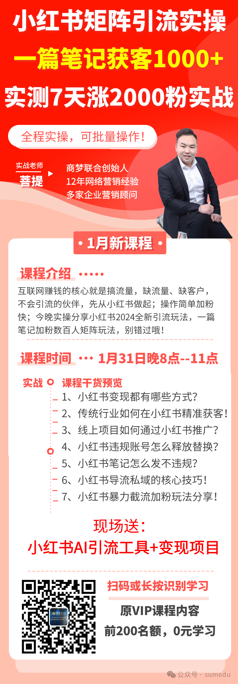 课程介绍:互联网赚钱的核心就是搞流量,缺流量、缺客户,不会引流的伙伴,先从小红书做起;操作简单加粉快;今晚实操分享小红书2024全新引流玩法,一篇笔记加粉数百人矩阵玩法,别错过哦!