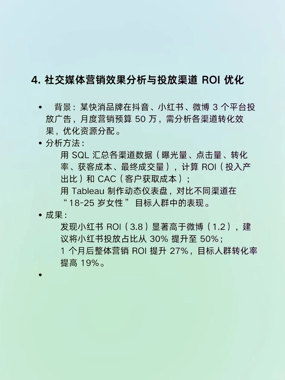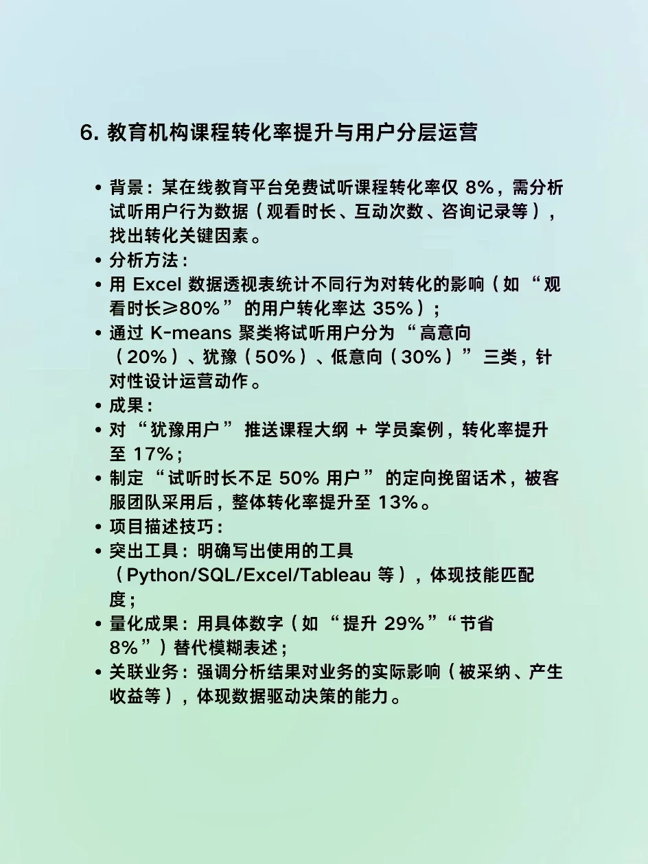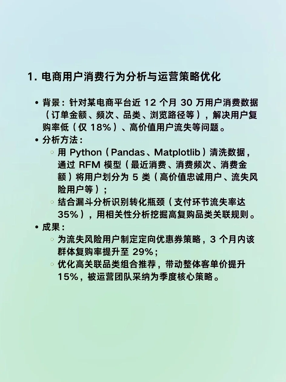 六个可以直接写进简历的数据分析项目 1. 电商用户消费行为分析与运营策略优化 2. 零售门店销售业绩归因与选址评估模型 3. 金融信贷用户信用风险评估与风控模型优化 4. 社交媒体营销效果分析与投放渠道 ROI 优化 5. 制造业生产设备故障预警与效率提升分析 6. 教育机构课程转化率提升与用户分层运营#计算机 #编程 #计算机专业 #数据分析 #数据分析我在行 #互联网大厂 #数据分析转行 #大数据转行 #数据库 #python #sql #数据分析项目 #可视化 #数据分析项目