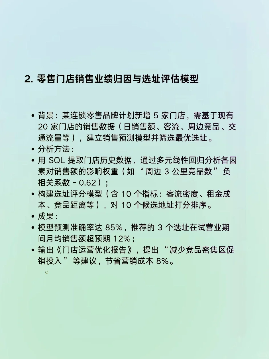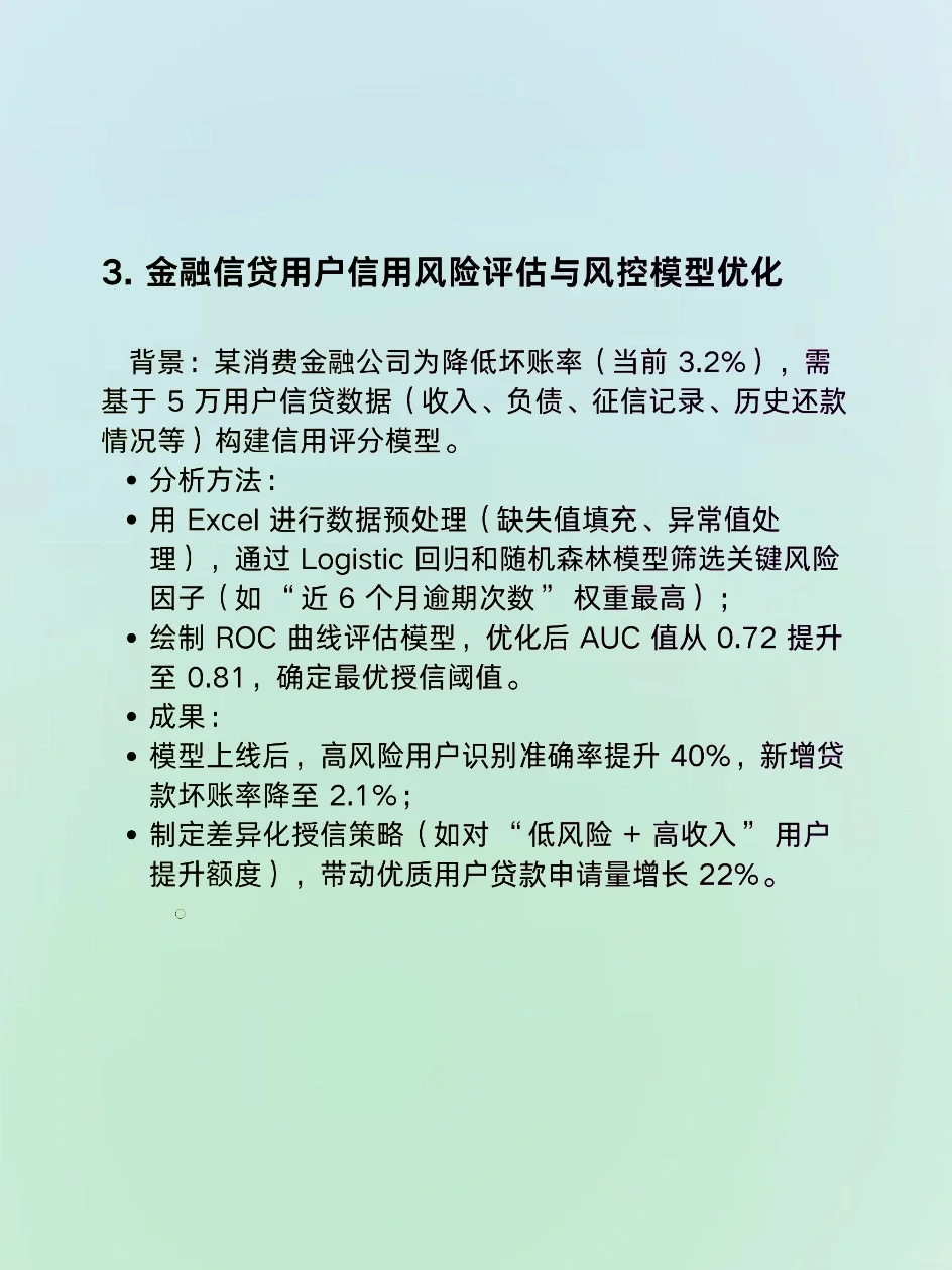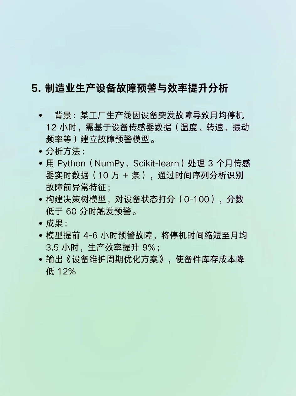 六个可以直接写进简历的数据分析项目 1. 电商用户消费行为分析与运营策略优化 2. 零售门店销售业绩归因与选址评估模型 3. 金融信贷用户信用风险评估与风控模型优化 4. 社交媒体营销效果分析与投放渠道 ROI 优化 5. 制造业生产设备故障预警与效率提升分析 6. 教育机构课程转化率提升与用户分层运营#计算机 #编程 #计算机专业 #数据分析 #数据分析我在行 #互联网大厂 #数据分析转行 #大数据转行 #数据库 #python #sql #数据分析项目 #可视化 #数据分析项目