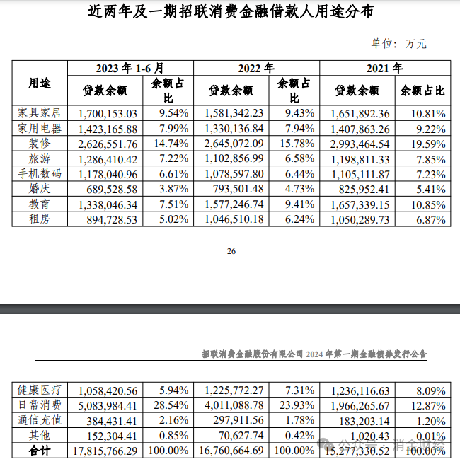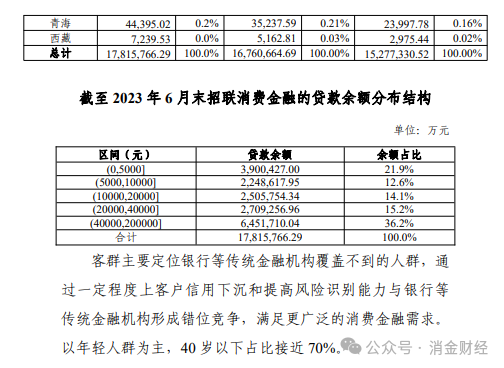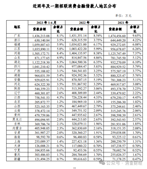 招联消费金融近三年相关借款人地区、 用途等放款分布情况及截至 2023 年 6 月末贷款发放金额分 布情况分别如下: