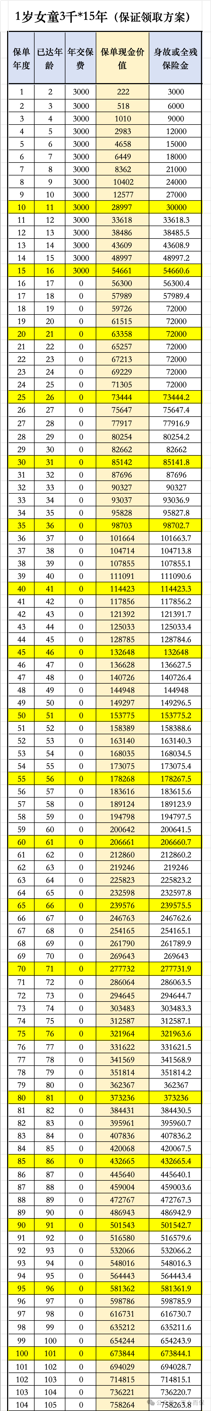 根据她孩子的情况(1岁女童),我们做了如下计划。每年存3千,存15年,刚好还是即将成年上大学,就可以拿出来读大学用。计划如下: