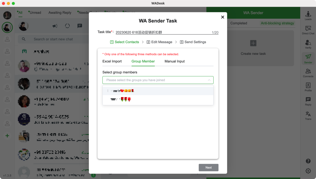 在获得目标客户的号码后,我们便可以使用WADesk来进行定时营销了,目前WADesk支持社群营销、群成员营销、联系人营销等功能。不仅可以根据分组,定时定量地给新客户发送WhatsApp开发信,也可以在节日、客户生日等特定节点给老客户发送折扣信息和促销活动等,帮助您在多样场景完成客户增长。