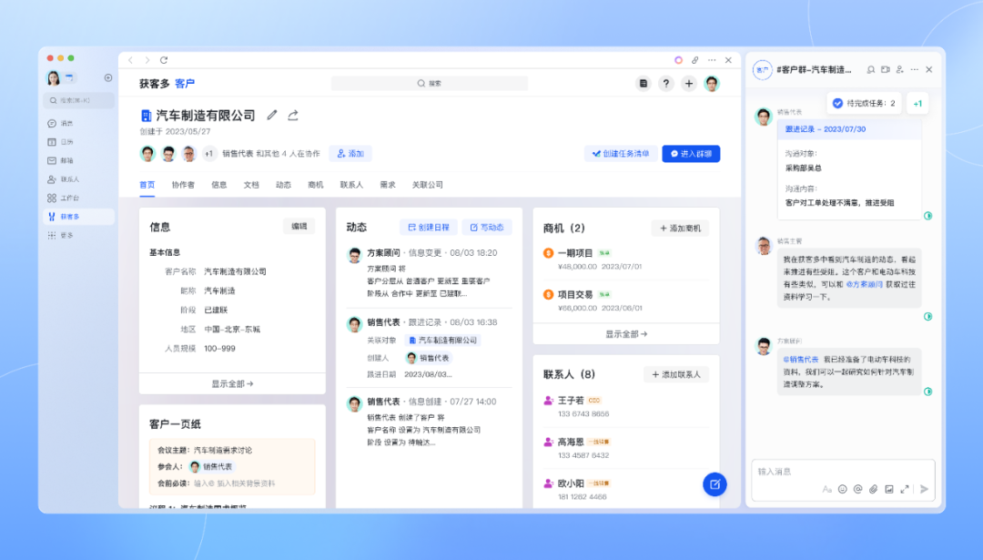 在全新版本飞书中,底层能力进一步开放。飞书与获客多共创首推「CRM 上飞书」,获客多成为主导航应用,让销售团队的业务工具就在手边。