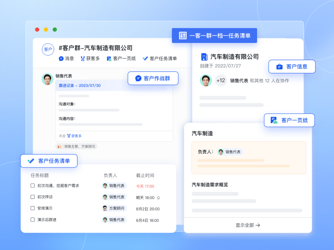 获客多与飞书共创推出「CRM 上飞书」、「一客一群」、「销售智能伙伴」等销售效率最佳实践,二者结合将销售效率提升到了前所未有的高度。