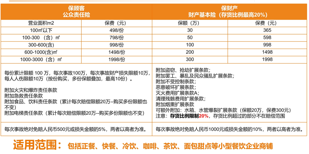 适用范围:含正餐、快餐、冷饮、咖啡、茶饮、面包甜点等小型餐饮企业商铺