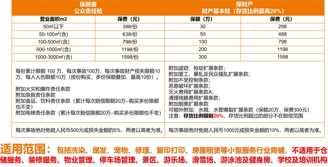 适用范围:包括洗染、理发、宠物、修理、复印打印、房屋租赁等小型服务行业商铺,不适用于仓储服务、装修服务、物业管理、停车场管理、景区、游乐场、滑雪场、游泳池及健身房、学校及培训机构