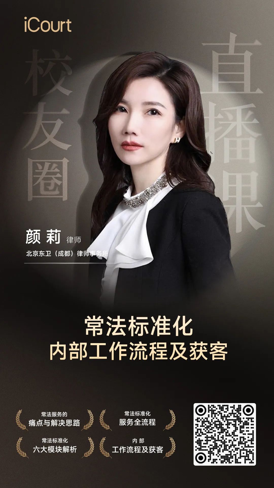 今晚直播课,特别邀请到了北京东卫(成都)律师事务所的颜莉律师,为大家带来「常法标准化:内部工作流程及获客」相关课程。课程干货满满!点击下方预约按钮,今晚为你介绍关于常法服务的六大模块内容。