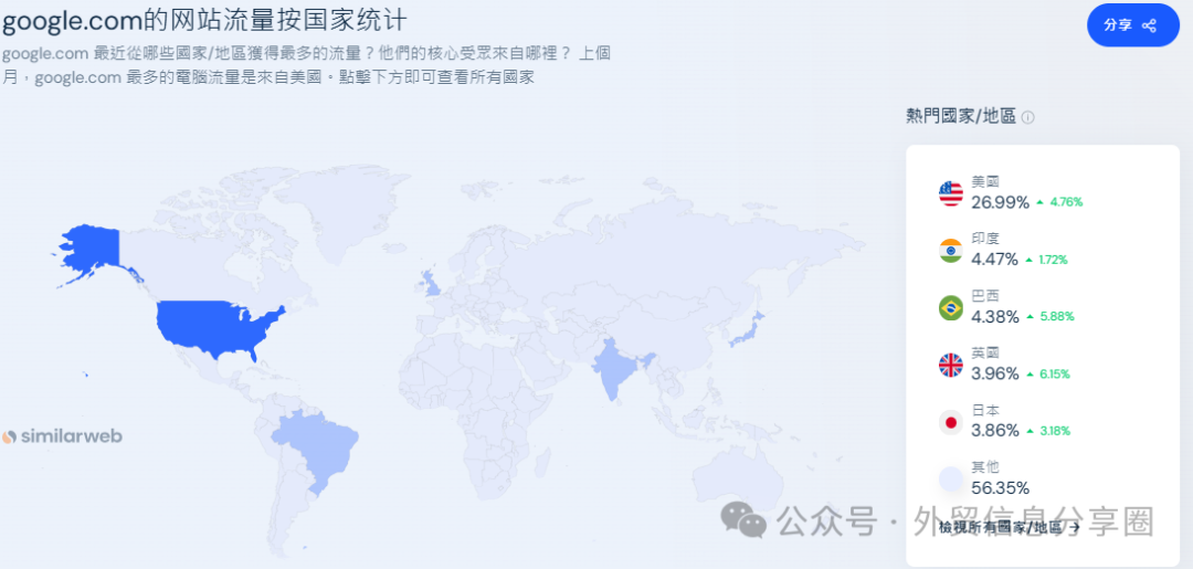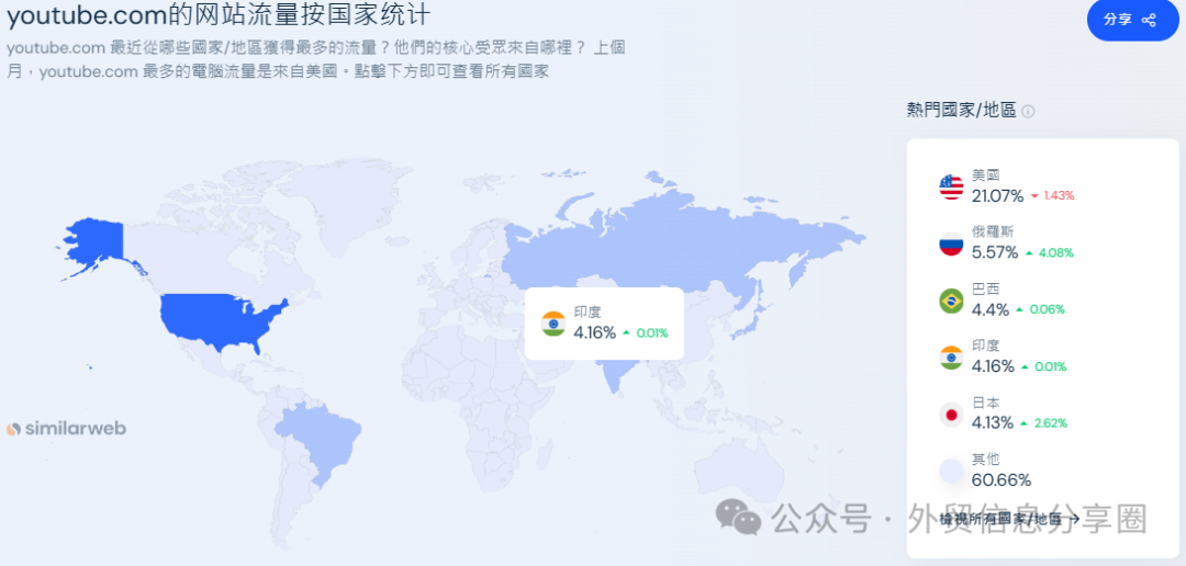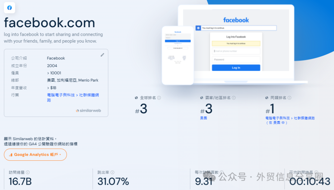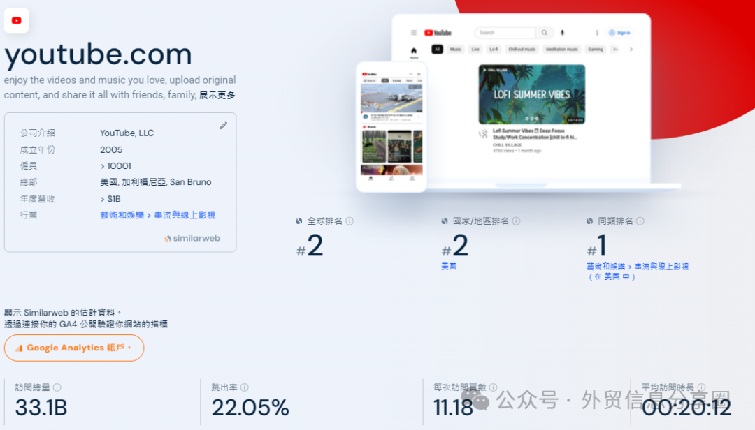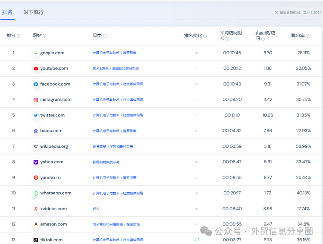一:全球流量排名图排名前十三图,Google YouTube facebook Instagram Yahoo yandex WhatsApp Tik Tok均为不错的渠道。除开这些: 领英也是一个不错的渠道。原因:领英6亿多的注册者,其中24%左右的用户都是决策层。圈子比较纯。二:Google YouTube facebook以及国内外贸主流平台流量情况1. Google 2. Youtube3.Facebook4. 国际站5. mic
