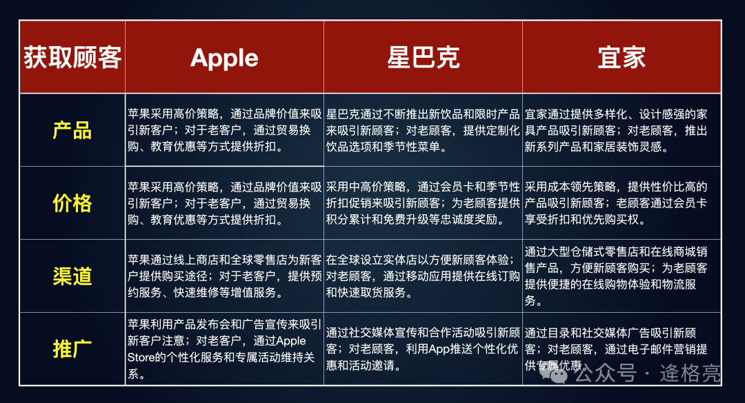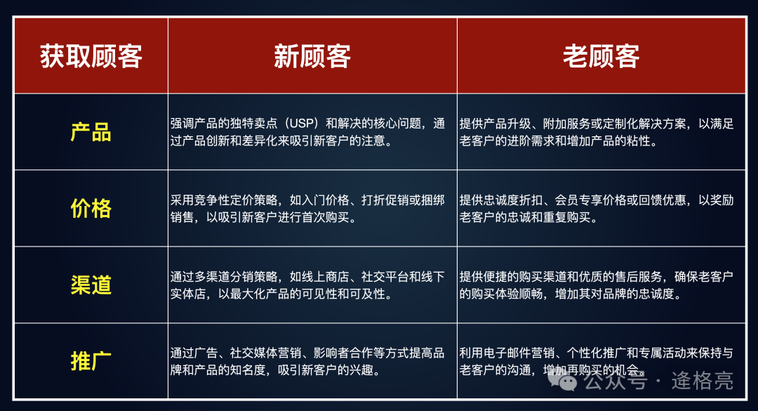 按照这个逻辑,就可以通过新老用户和 4P组合,分解出我们常见一些公司的获客策略: