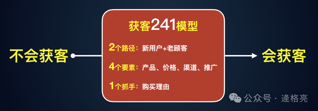 这就是营销获客。两大路径:新顾客和老顾客,四大要素:产品、价格、渠道、推广。一个抓手:购买理由。简称为:241 获客模型。