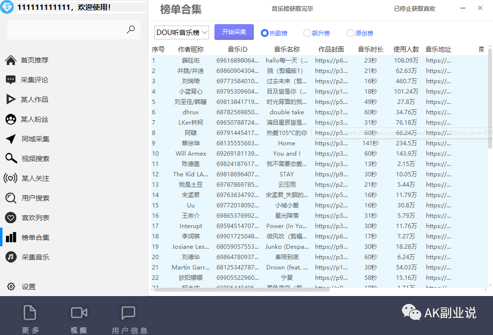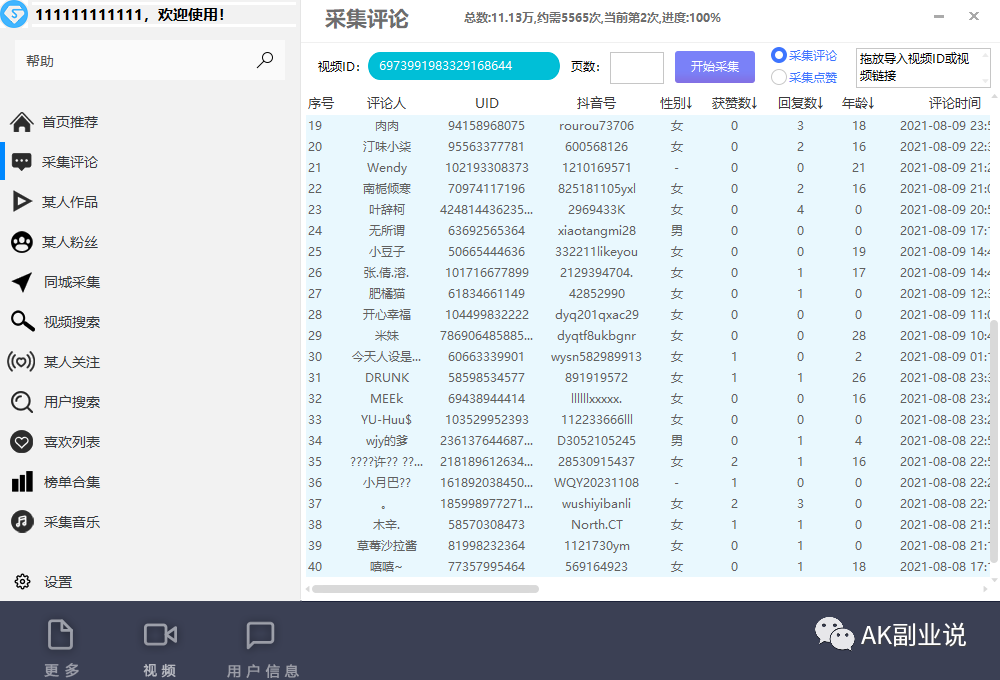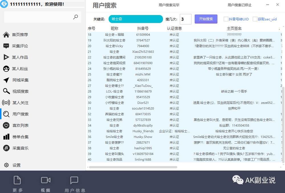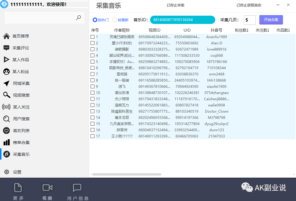 支持获取内容:直播间ID,抖音等级,昵称,个人二维码,关注数,粉丝数,作品数,UID,抖音号,主页地址