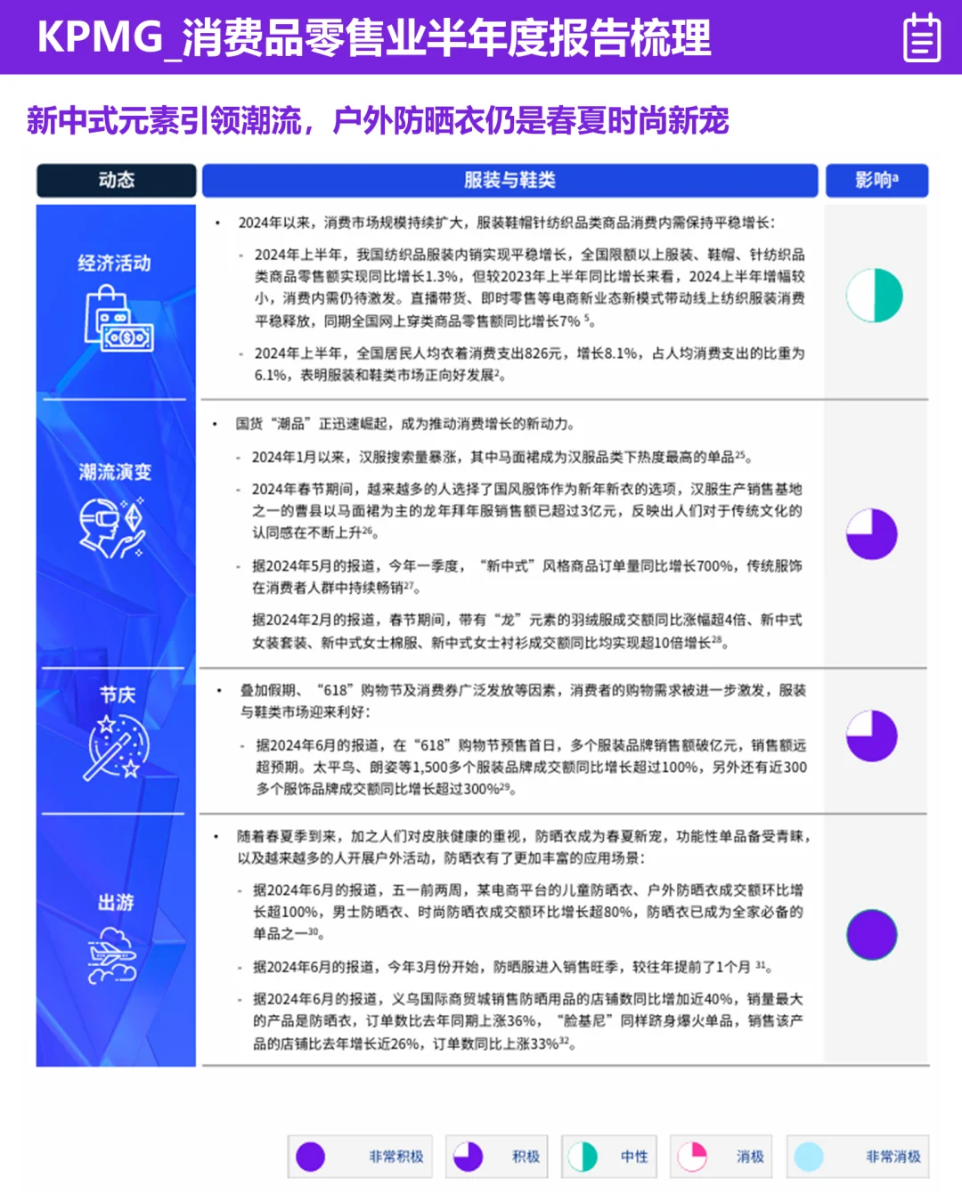 📝服装与鞋类:2024年上半年,我国纺织品服装内销实现平稳增长,全国限额以上服装、鞋帽、针纺织品 类商品零售额实现同比增长1.3%,但较2023年上半年同比增长来看,2024上半年增幅较小,消费内需仍待激发