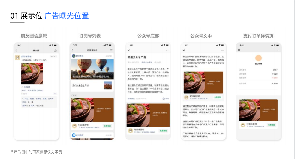 广告曝光位置有朋友圈信息流、订阅号列表、公众号底部、公众号文中、支付订单详情页等五个广告位。