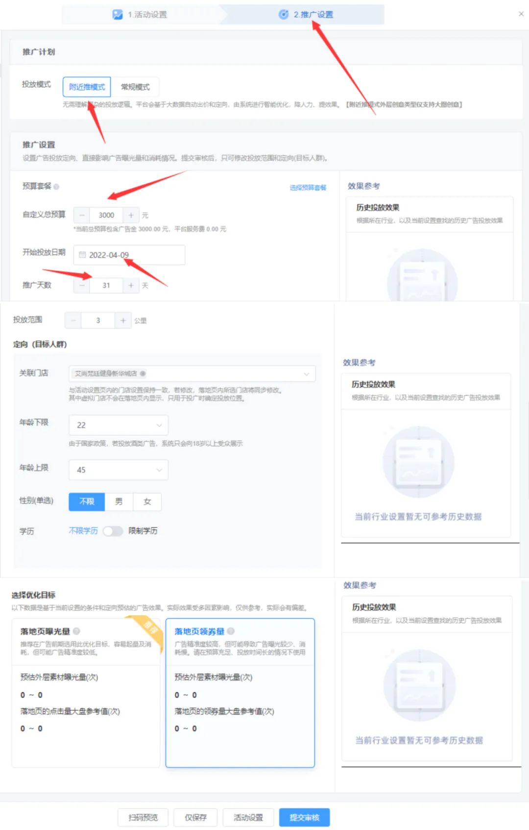 定向算法:算法将优先在门店周边0.5km内寻找合适的用户,若人群较少,系统 会自动逐步亏站定向范围,支持最大范围3km-20km自由设置。