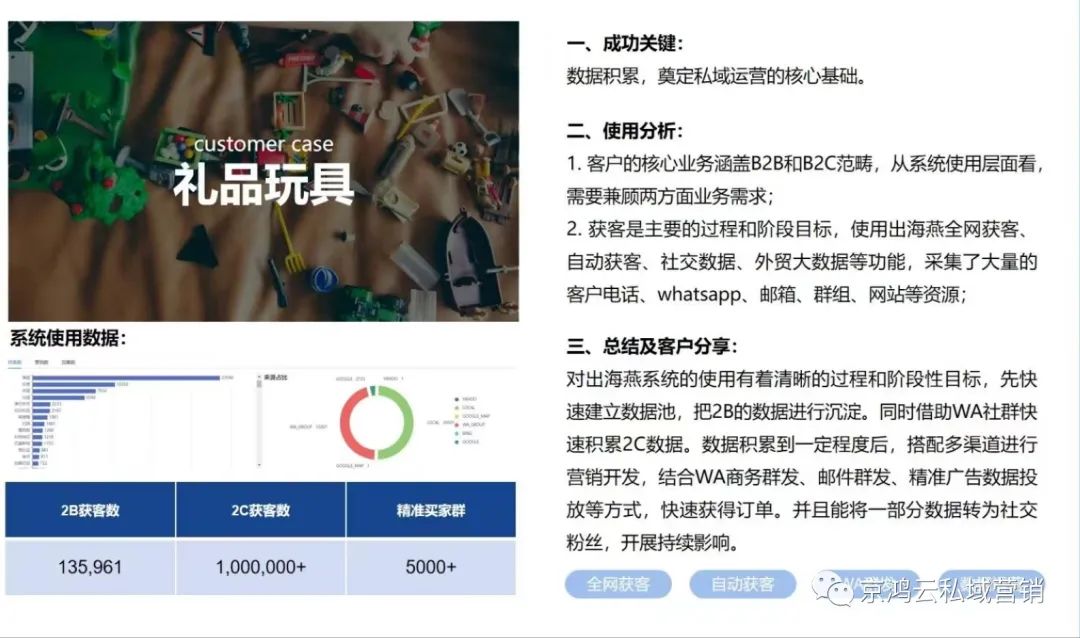 礼品玩具外贸获客案例反馈,TO B获客数135961个,to C获客数100万+,精准买家数5000+,客户对出海燕的使用有着清晰的过程和阶段性目标,每天坚持让系统自动获客,多渠道进行营销开发,快速获得订单,针对有反馈的客户进行二次营销乃至多次的营销,量大必有成交!