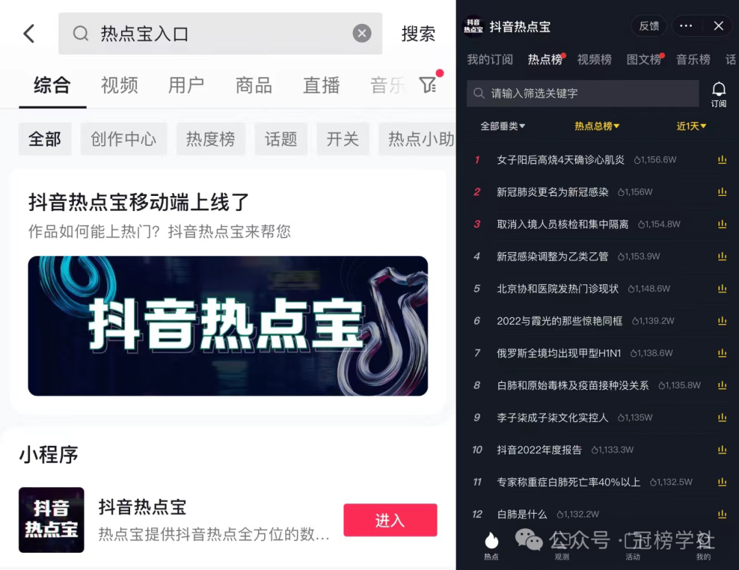 比如,在抖音搜索“热点宝入口”,就能找到官方的热点和话题榜单,在这些话题下发布视频,就能获得官方的流量支持。
