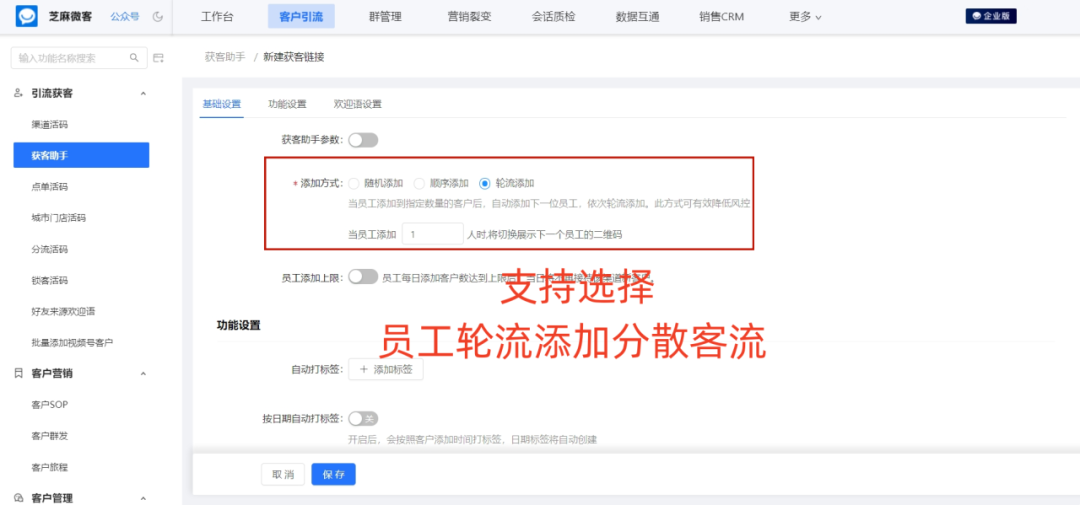 2、客户分流。企业通过芝麻微客使用获客助手时,可以在一个短链接下设置多个接待人员,这样可以分散客户,让客户得到员工更加贴心的服务。