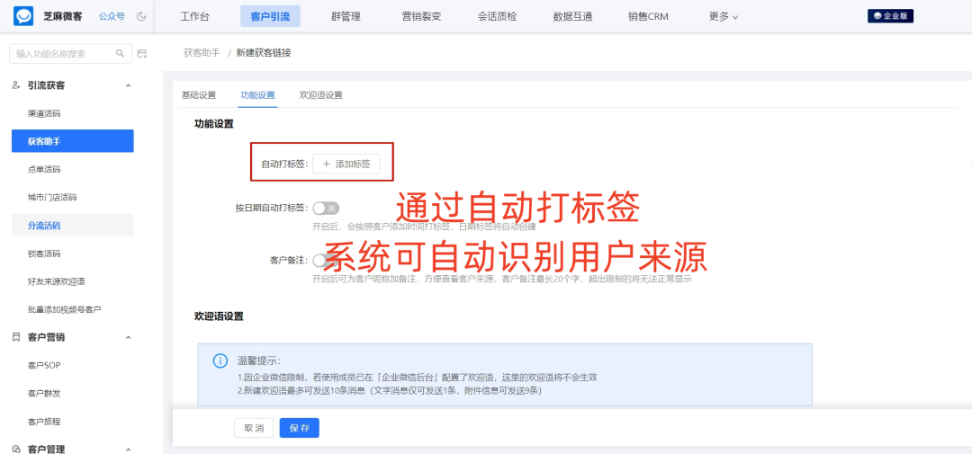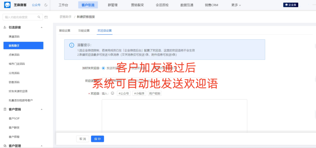 3、自动发送欢迎语。通过芝麻微客获客助手,企业能够给不同的获客链接配置不同的欢迎语并支持插入公众号小程序和用户昵称,可以大大地减少员工与客户对接的工作量。