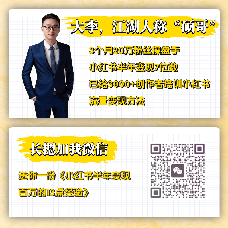 我是大李,一位专注帮实体商家、个体创业者、想做 IP、知识付费的朋友,解决小红书获客变现难题的自媒体创业者。