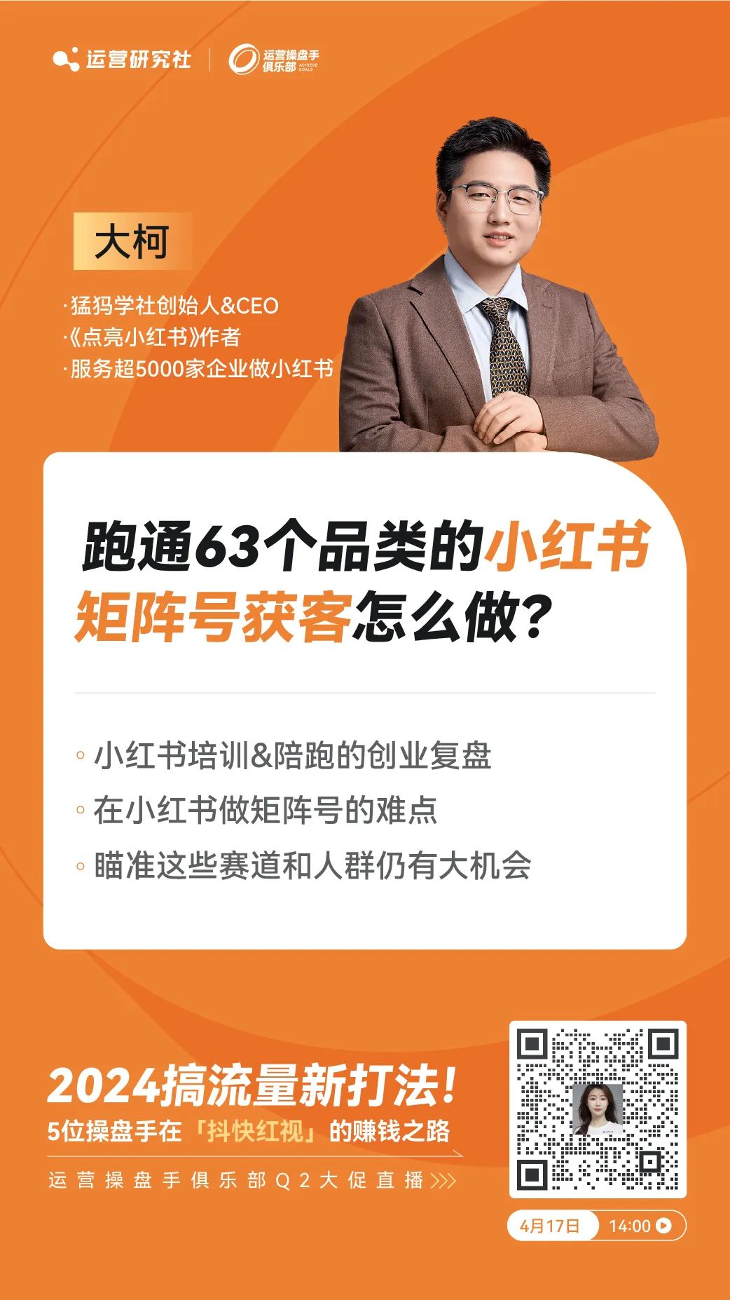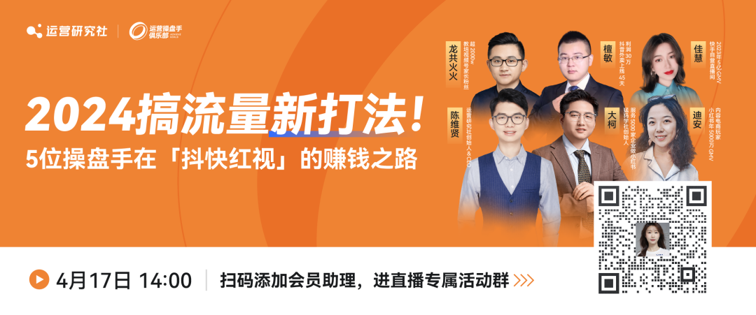 运营操盘手俱乐部 2024 Q2 嘉宾分享,我们正在围绕「公域流量变现」进行筹备,邀请在大家最关心的平台拿到结果的操盘手,详细拆解自己是怎么赚到钱的。我们会在 4.17(周三)14:00,在“运营研究社”视频号,举办「2024 搞流量新打法」Q2 分享前瞻大促直播。
