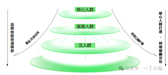 反漏斗本质上就是破圈的过程,先培养核心人群,然后通过自然口碑的扩散和商业流量助推,从核心人群扩散到高潜人群,再到泛人群。